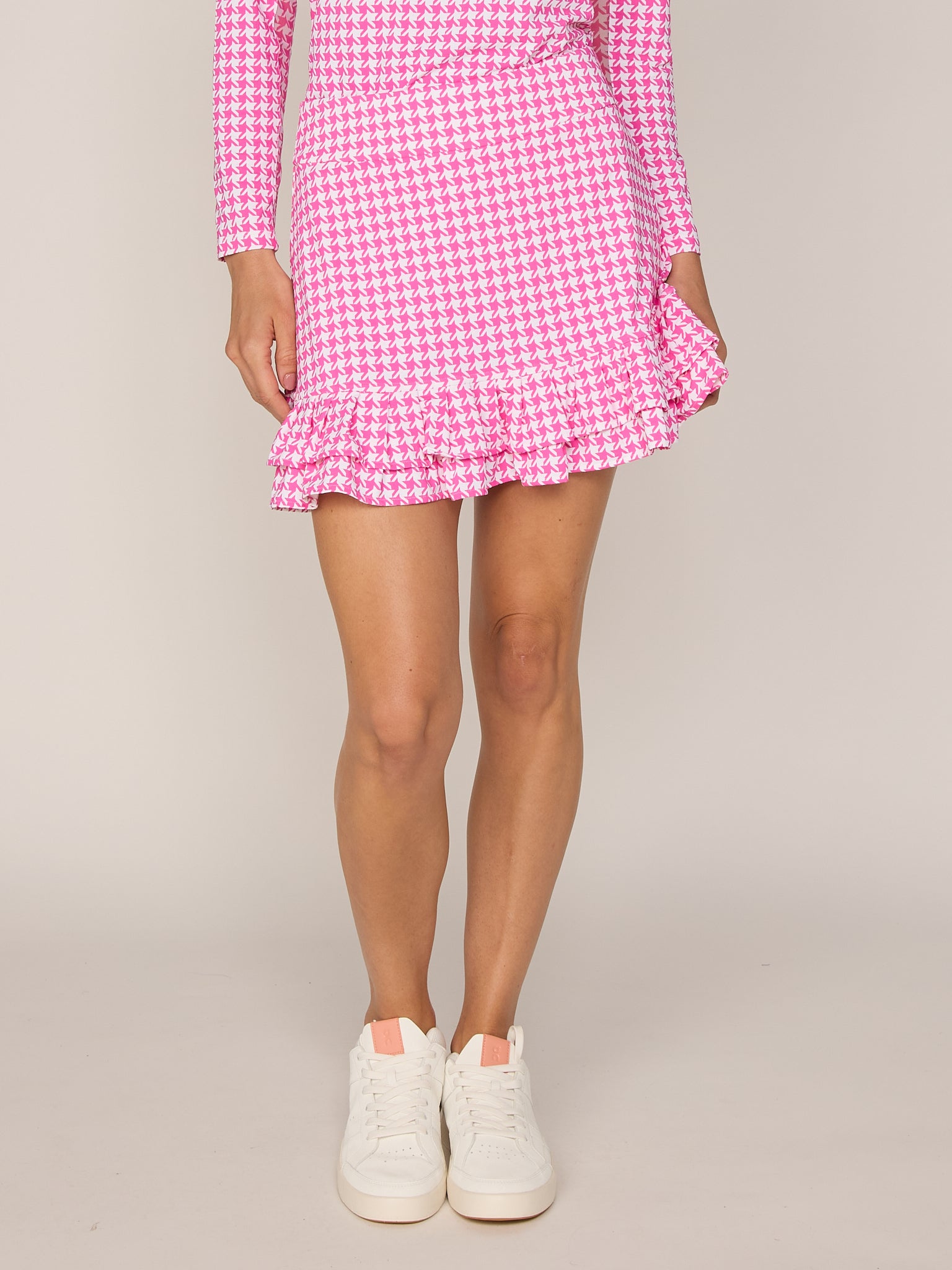 Double Ruffle Skort In Pink Houndstooth